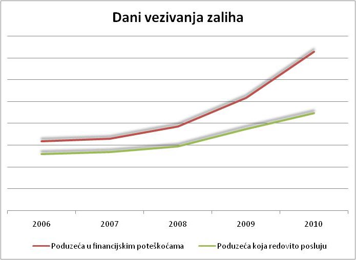 Na grafikonu možemo vidjeti kretanje ovog pokazatelja za skupinu poduzeća koja su se u 2011. g. našla u financijskim problemima i skupinu poduzeća koja posluju bez poteškoća. Za problematična poduzeća može se uočiti viša razina ovog pokazatelja u čitavom promatranom razdoblju, ali i znatno brži rast s dolaskom ekonomske krize, odnosno povećanje razlike u danima vezivanja u odnosu na društva koja nisu u problemima. Ovo sugerira da se dani vezivanja zaliha mogu promatrati kao jedan od indikatora za predviđanje potencijalnih financijskih problema.