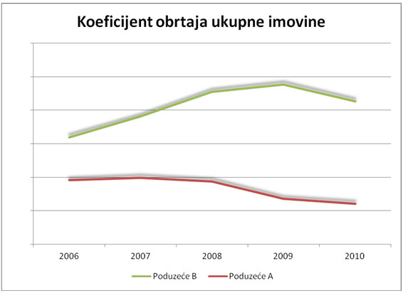 Proučit ćemo kretanje koeficijenta obrtaja ukupne imovine na primjeru usporedbe dvaju hrvatskih poduzeća koja ćemo nazvati A i B. Iz grafikona je vidljivo da poduzeće B daleko učinkovitije koristi svoje resurse i da ta učinkovitost raste sve do 2009.g. Poduzeće A znatno je neefikasnije u korištenju imovine, a koeficijent obrtaja ukupne imovine od 2008.g. značajno pada. S obzirom na navedeno, ne čudi da se poduzeće A na kraju promatranog razdoblja našlo u financijskim problemima.