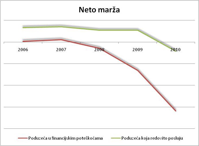 Na slici možemo vidjeti razinu neto marže kroz vrijeme za skupinu poduzeća koja su se u 2011.g. našla u financijskim problemima i skupinu poduzeća koja posluju redovito. Problematičnu skupinu poduzeća karakterizira izrazito niska neto marža prije ekonomske krize i negativna neto marža koja se ubrzano pogoršava s dolaskom krize, 2008.g. i kasnije).